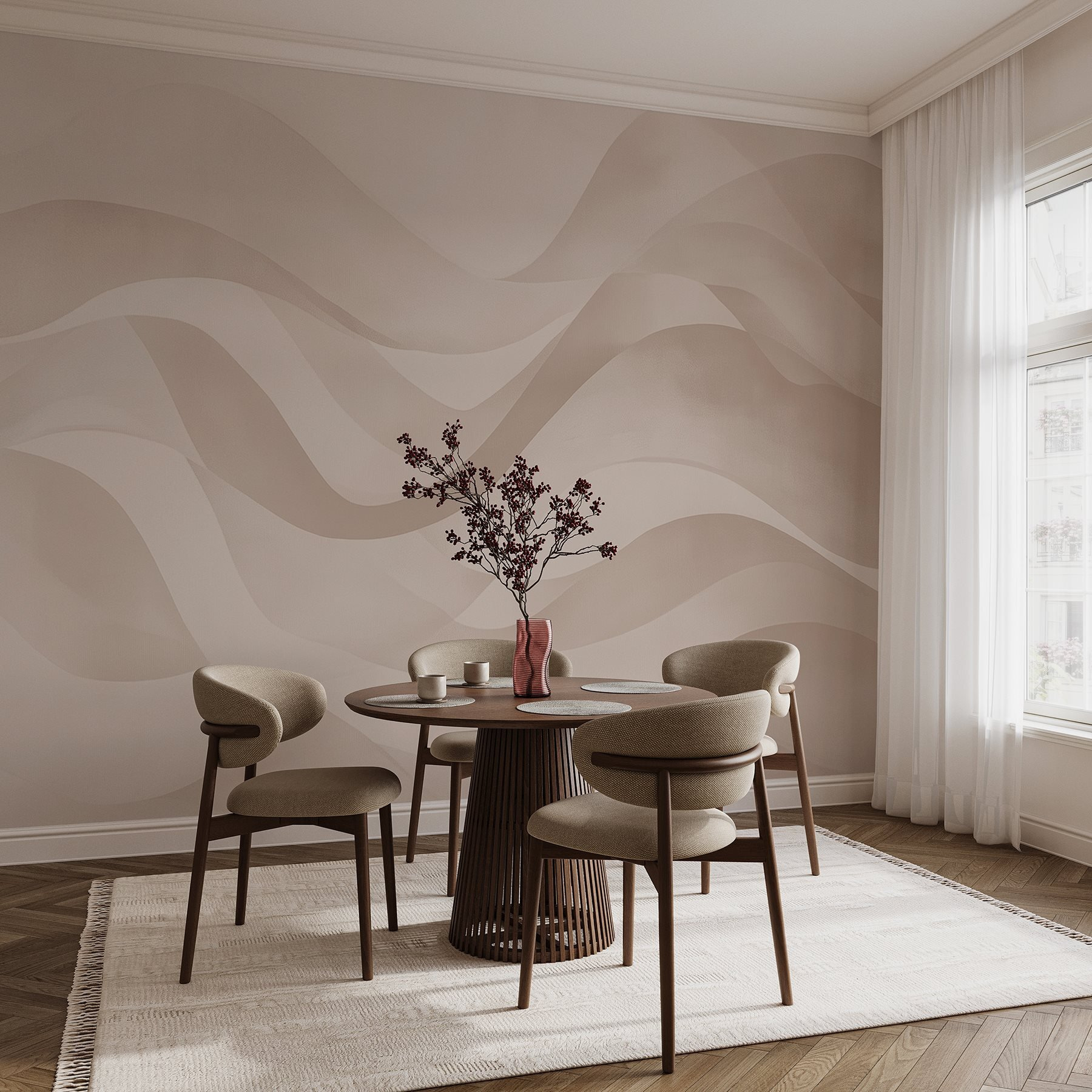 Immaginate di entrare in una stanza dove le pareti sussurrano tranquillità. Questo murale, con le sue morbide onde bianche e rosa, ricorda la brezza di una domenica mattina. Le tonalità rilassanti creano uno sfondo sereno, perfetto per rilassarsi dopo una lunga giornata o per stimolare le conversazioni con gli amici. Non riuscite a immaginarlo? Magari con una sedia accogliente e una tazza di tè fumante nelle vicinanze, o magari con una piccola galleria di ricordi incorniciati che mostrano i momenti più belli della vita. Questo murale non si limita a decorare, ma trasmette una sorta di calma che avvolge come un caldo abbraccio. Ideale per qualsiasi spazio che desideri un tocco di eleganza, trasforma le pareti ordinarie in una fuga da sogno. Perfetto per quei momenti in cui si ha bisogno di un promemoria per respirare e godere dei piccoli piaceri della vita!