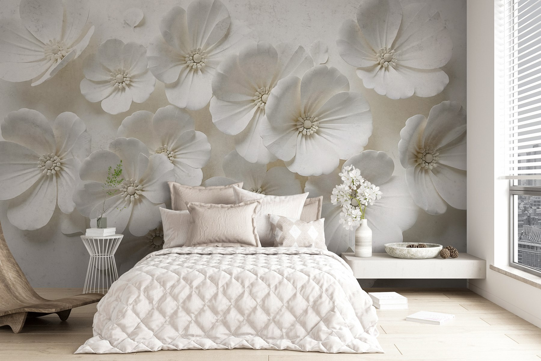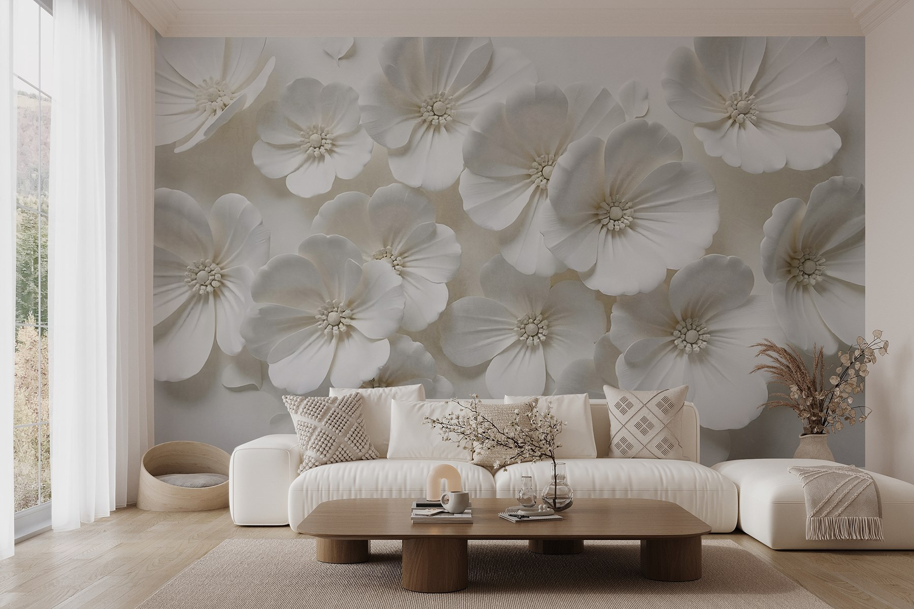 Trasformate il vostro spazio in un rifugio sereno con questo splendido murale, caratterizzato da un delizioso grappolo di fiori bianchi. È come portare una boccata d’aria fresca in casa, ovviamente senza polline! Immaginate di svegliarvi ogni mattina con una delicata fioritura, senza bisogno di annaffiare!