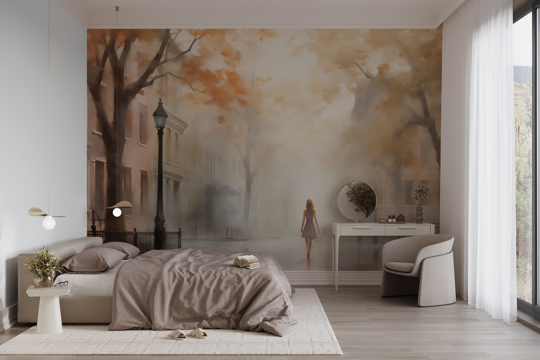 Immaginate una donna che passeggia lungo una strada nebbiosa, avvolta dalle calde tonalità dell’autunno. Questo murale non è solo arte: è una porta verso una fuga da sogno. Immaginatelo illuminare il vostro salotto o la vostra accogliente camera da letto, attirando chiunque lo intraveda. La nebbia crea un senso di mistero, facendo sentire ogni sguardo come un’avventura. Inoltre, l’atmosfera nostalgica? Perfetta per le serate passate a ricordare o a pianificare la prossima fuga. È come invitare una serena fetta di vita cittadina a casa vostra, un passo sognante alla volta: che atmosfera!