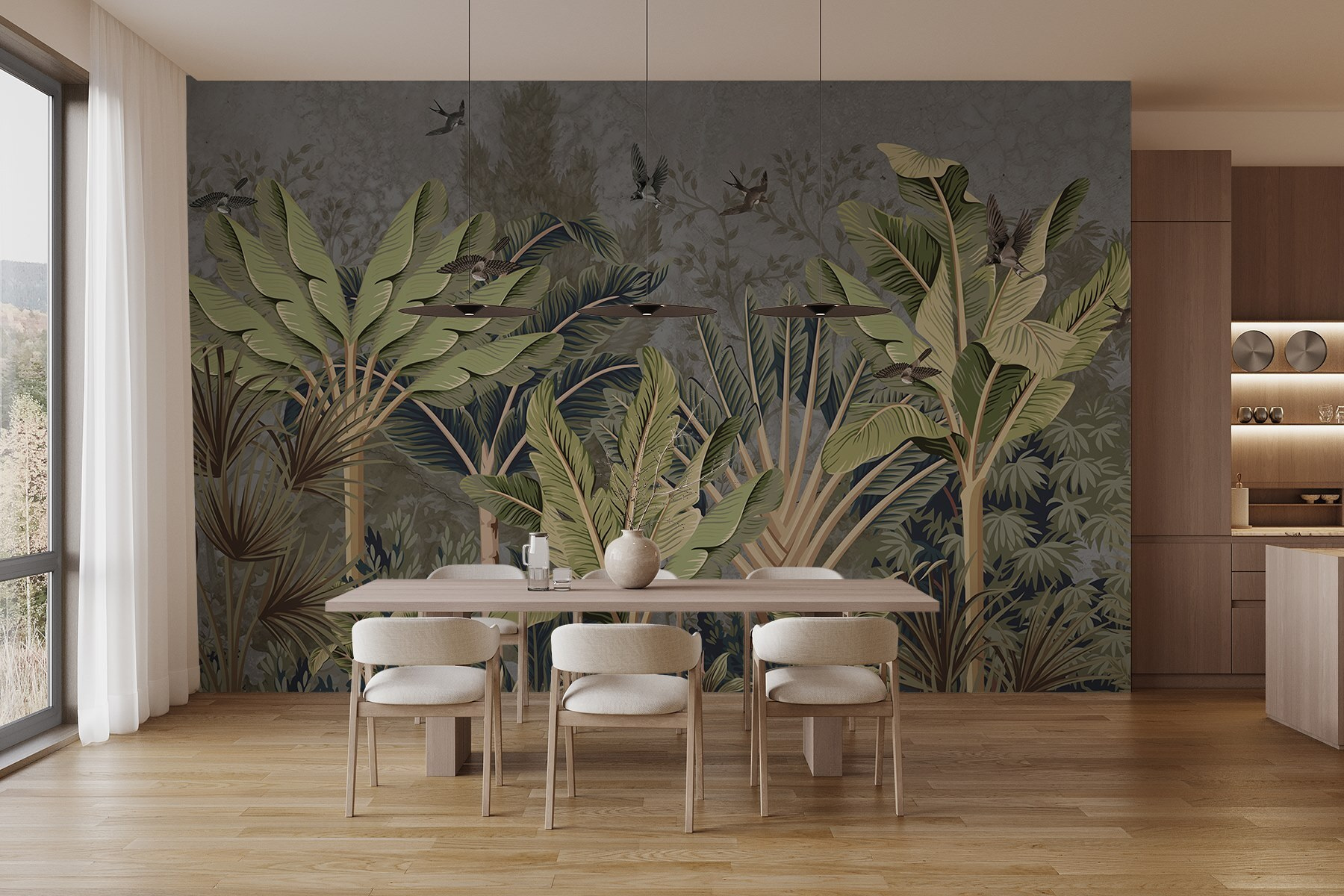 Trasformate qualsiasi stanza in una fuga serena con questo splendido murale della foresta tropicale. Immaginate di entrare in un paradiso lussureggiante, dove le foglie vibranti ondeggiano dolcemente e gli uccelli svolazzano, portando i sussurri della natura selvaggia. Non si limita a decorare una parete, ma racconta una storia, invitando a sognare ad occhi aperti avventure esotiche. Perfetto per un accogliente angolo lettura o per un vivace spazio abitativo, aggiunge calore e un pizzico di aria aperta. Inoltre, è un ottimo spunto di conversazione: aspettate che gli ospiti vi chiedano se siete diventati segretamente degli esploratori della giungla! Abbracciate la natura senza le zanzare.