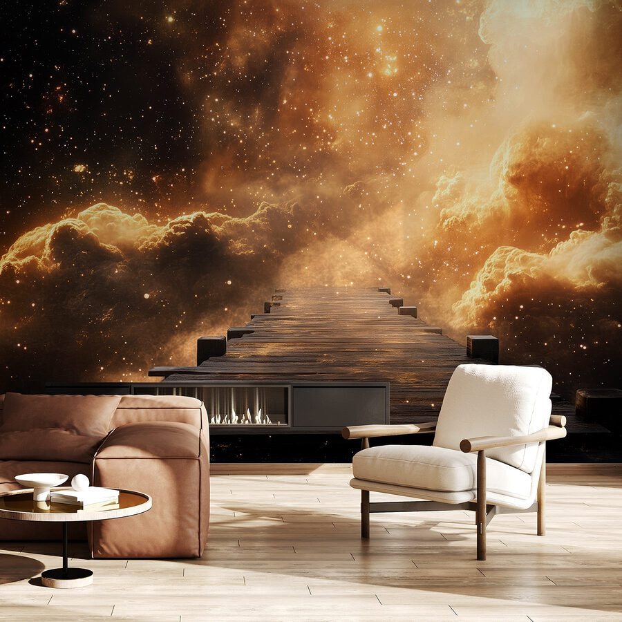 Trasforma il tuo spazio con il “Murale Ponte di legno che conduce alle nuvole”. Immagina di camminare su un ponte di legno consumato dal tempo che sembra protendersi verso una galassia da sogno. Suscita un senso di avventura, come una sensazione del tipo “dove finirò?”. Le tonalità vivaci mescolano toni caldi e freddi, creando uno sfondo magico che risveglia l’immaginazione. Immagina quelle tranquille mattine in cui sorseggi il caffè mentre ammiri un cielo cosparso di stelle e nuvole: pura beatitudine. È perfetto per stimolare la creatività o semplicemente per sognare ad occhi aperti. Questo murale ha un’eleganza semplice, che porta un tocco di fantasia direttamente nella tua casa. Chi non vorrebbe fuggire tra le nuvole di tanto in tanto?