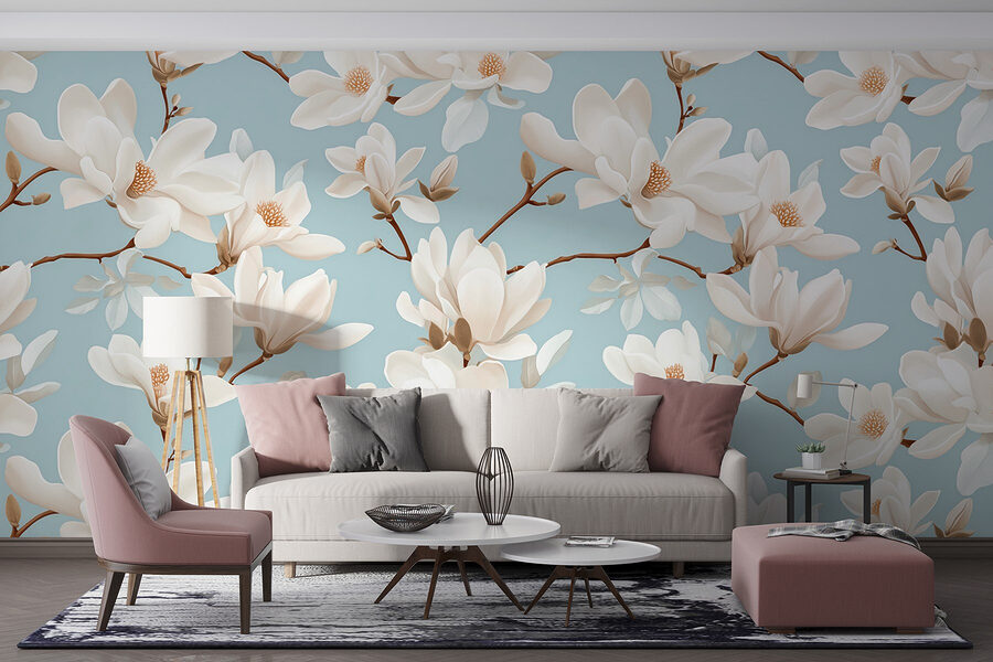 Trasforma il tuo spazio con lo splendido “Murale con motivo di fiori bianchi”. Immagina di entrare in una stanza dove graziose magnolie sbocciano su uno sfondo blu cielo rilassante. È come avere la primavera in casa tutto l’anno! I petali delicati e i colori tenui creano un’atmosfera rilassante, perfetta per distendersi dopo una lunga giornata o per rannicchiarsi con un buon libro. Gli amici entreranno e penseranno che ti sei rifugiato in un giardino lussureggiante! Inoltre, ti ricorderà che la bellezza può essere a portata di mano. Chi avrebbe mai detto che l’arredamento della casa potesse essere così rinfrescante e allegro?