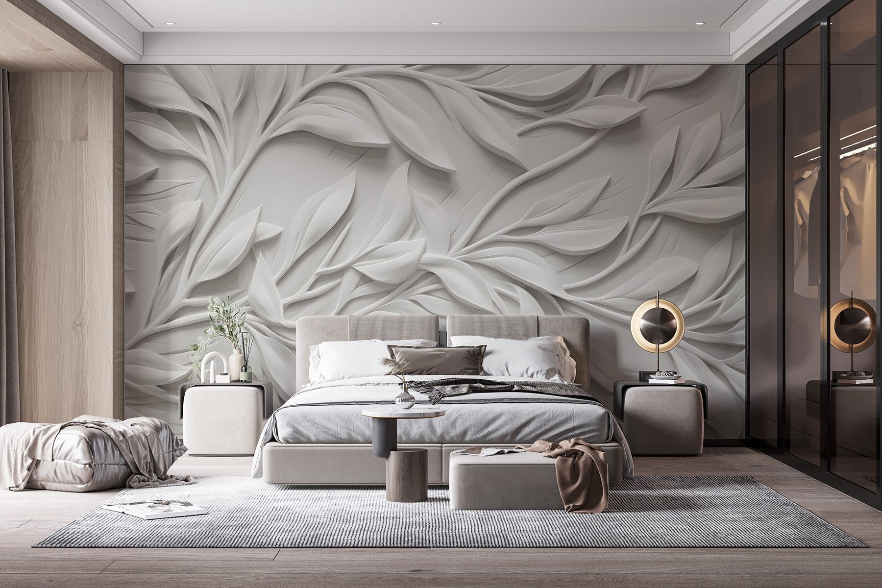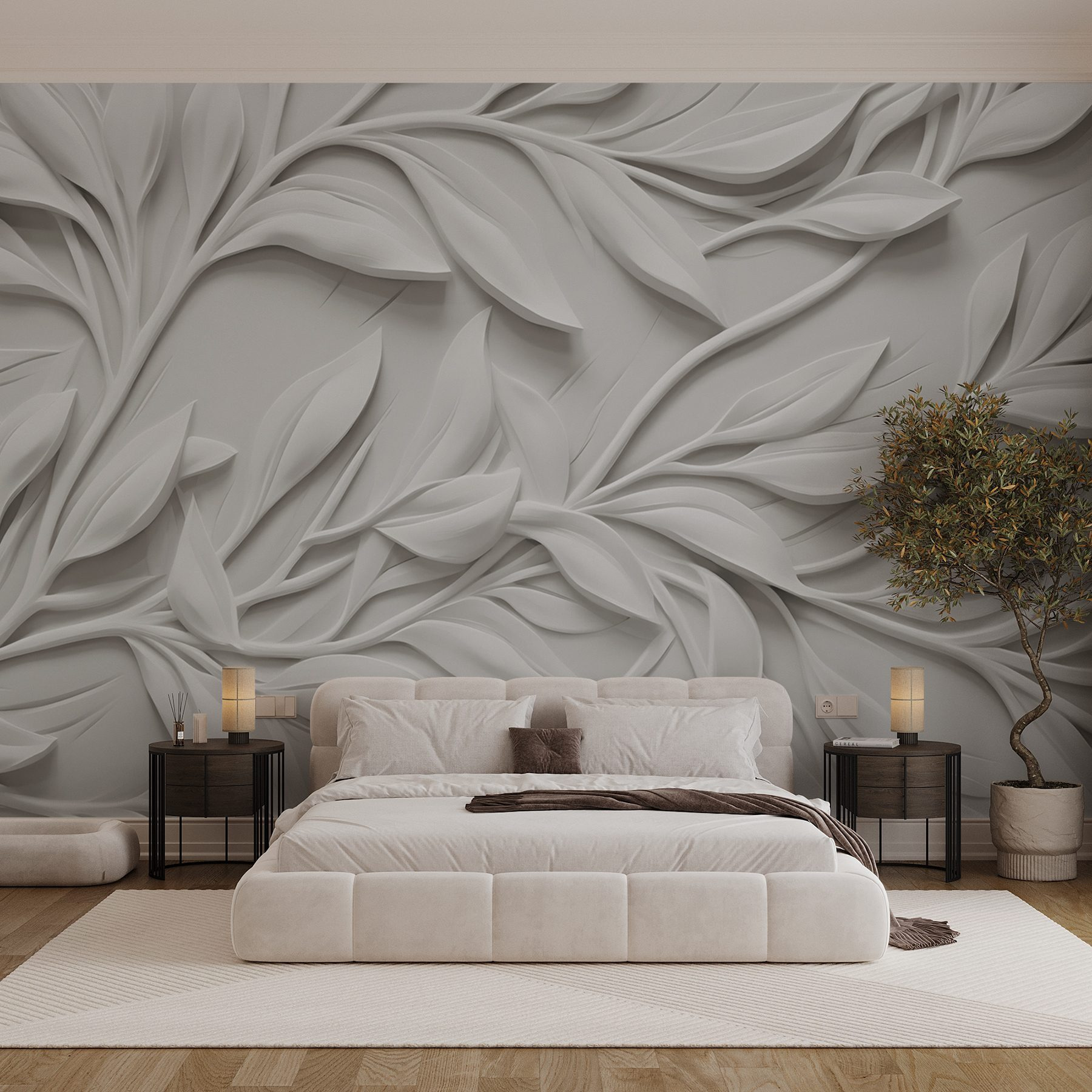 Trasforma il tuo spazio con questo splendido “Murale bianco con foglie”. Immagina di entrare in una stanza dove foglie morbide e scultoree sembrano danzare sulla parete. È come se la natura si fosse presa una piccola vacanza al chiuso! Il fresco sfondo bianco fa risaltare i complessi disegni delle foglie, emanando un’atmosfera fresca, rilassante e chic. I tuoi amici potrebbero pensare che hai portato un pezzo di un bellissimo giardino all’interno. Perfetto per un accogliente angolo lettura o una sofisticata zona pranzo, questo murale aggiunge quel tocco di eleganza che rende ogni stanza un po’ più raffinata. Riesci a immaginarti mentre sorseggi un tè immerso in questa serena bellezza?