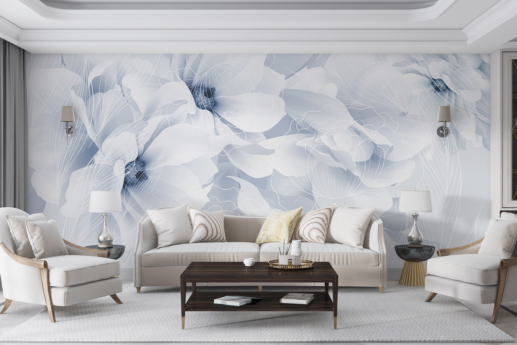 Guardate esattamente come apparirà il vostro spazio con la nuova carta da parati prima di acquistarla. Visualizzazione professionale da parte di designer esperti senza alcun costo o obbligo di acquisto.