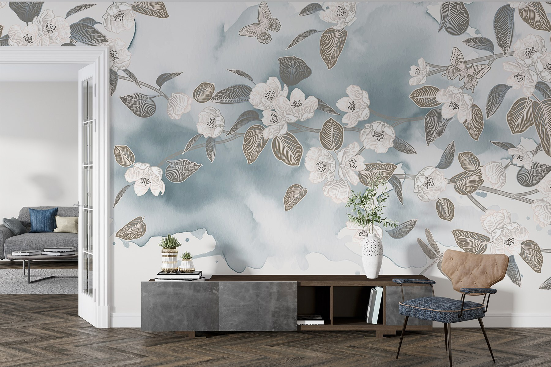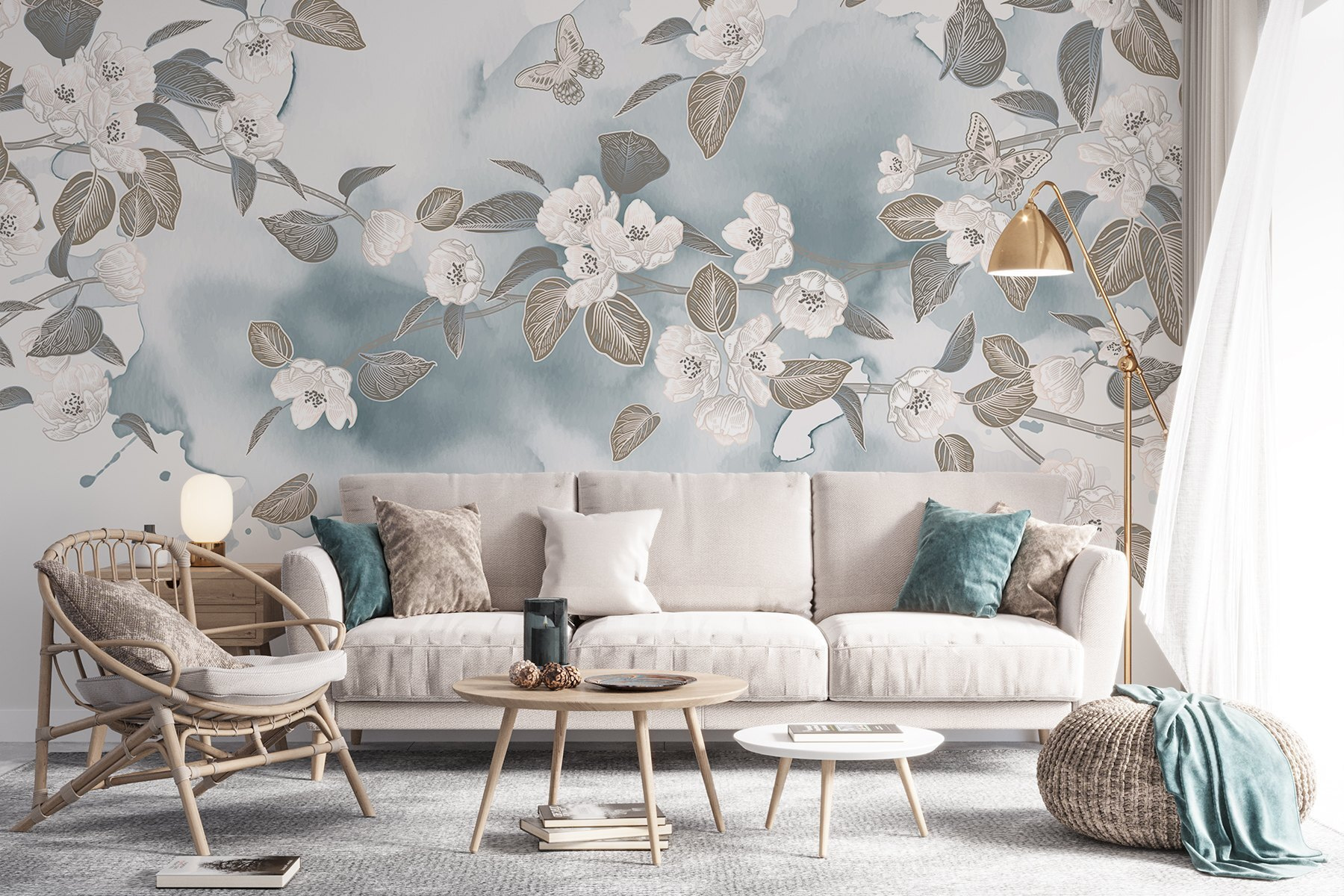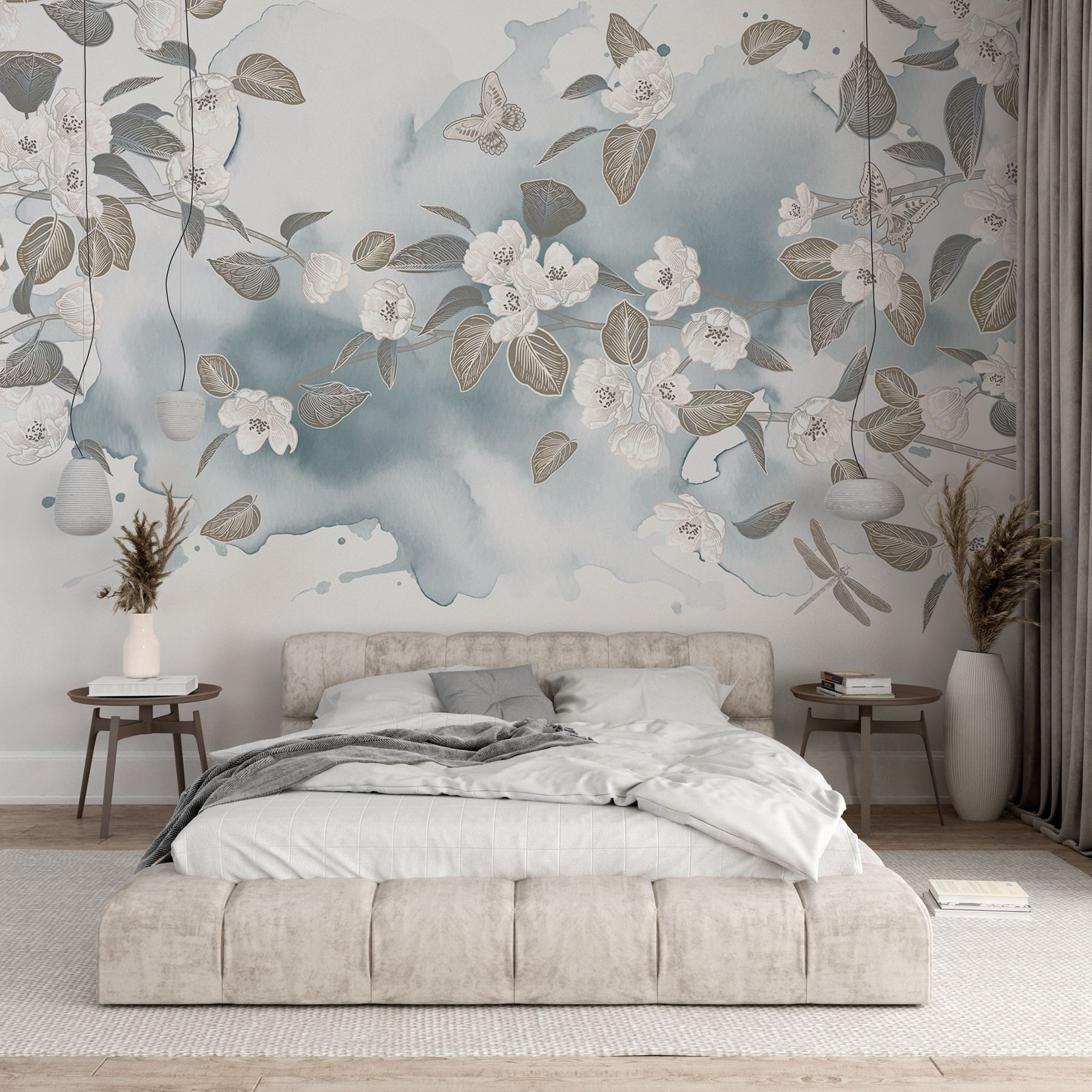 Trasformate qualsiasi stanza con questo splendido murale con fiori e foglie bianche che danzano su un sereno sfondo blu. Immaginate di svegliarvi con questa bellezza delicata: è come se la primavera si fosse posata proprio sulle vostre pareti. L’effetto acquerello aggiunge un’atmosfera morbida e sognante che può illuminare anche le giornate più cupe. Che sia in un accogliente soggiorno o in una tranquilla camera da letto, questo murale invita alla pace e alla tranquillità. Perfetto per chi adora la natura ma magari dimentica di annaffiare le piante. È una piccola fuga a casa, che fa sentire ogni momento un po’ più speciale. Un tocco perfetto, no?