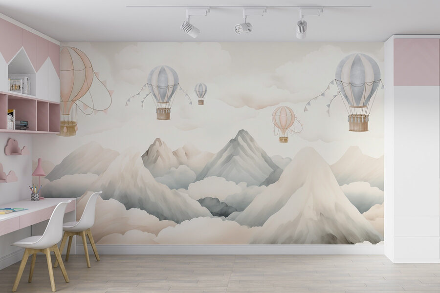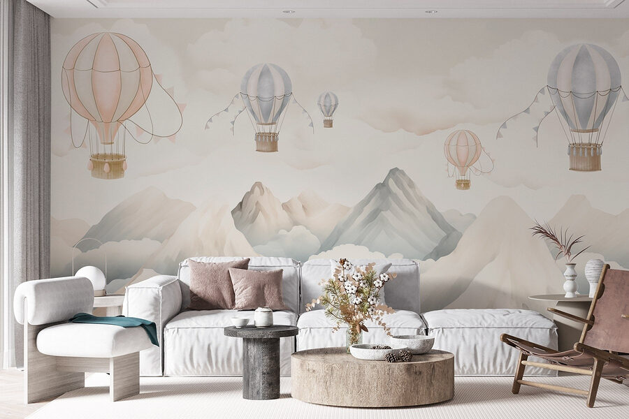 Immaginate di entrare in un mondo in cui le mongolfiere scivolano pigramente sopra montagne maestose, circondate da nuvole soffici e gonfie. Questo murale conferisce un’atmosfera serena a qualsiasi spazio, come se si stesse guardando fuori da una finestra in un paesaggio da sogno. Immaginate un angolo accogliente dove sorseggiare il vostro caffè mattutino, sentendovi ispirati dall’avventura che vi aspetta appena oltre le vostre mura. I delicati colori pastello invitano al calore e alla calma, perfetti per la camera dei bambini o per una zona living rilassata. È il tipo di murale che fa sognare a occhi aperti e invita ad assaporare le semplici gioie della vita, come quella di fluttuare nel cielo.