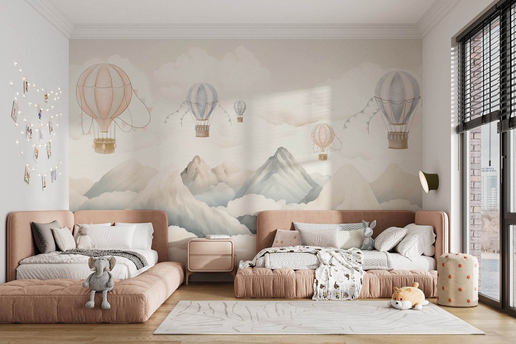 Immaginate di entrare in un mondo in cui le mongolfiere scivolano pigramente sopra montagne maestose, circondate da nuvole soffici e gonfie. Questo murale conferisce un’atmosfera serena a qualsiasi spazio, come se si stesse guardando fuori da una finestra in un paesaggio da sogno. Immaginate un angolo accogliente dove sorseggiare il vostro caffè mattutino, sentendovi ispirati dall’avventura che vi aspetta appena oltre le vostre mura. I delicati colori pastello invitano al calore e alla calma, perfetti per la camera dei bambini o per una zona living rilassata. È il tipo di murale che fa sognare a occhi aperti e invita ad assaporare le semplici gioie della vita, come quella di fluttuare nel cielo.