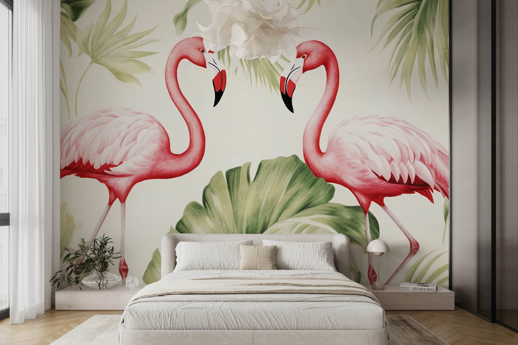 Trasformate il vostro spazio in un paradiso tropicale con questo vivace murale che raffigura una coppia di vivaci fenicotteri rosa circondati da foglie verdi. È come avere una mini vacanza a casa vostra! Immaginate di svegliarvi ogni giorno con questi stravaganti uccelli in posa giocosa su uno sfondo morbido. I colori freschi danno vita a qualsiasi stanza, rendendola invitante e divertente. Che si tratti di un accogliente salotto o di uno spazio di lavoro stimolante, questo murale aggiunge un tocco di personalità. Amici e parenti ne parleranno sicuramente. Potreste anche intravedere un cocktail di fenicotteri nel vostro futuro!