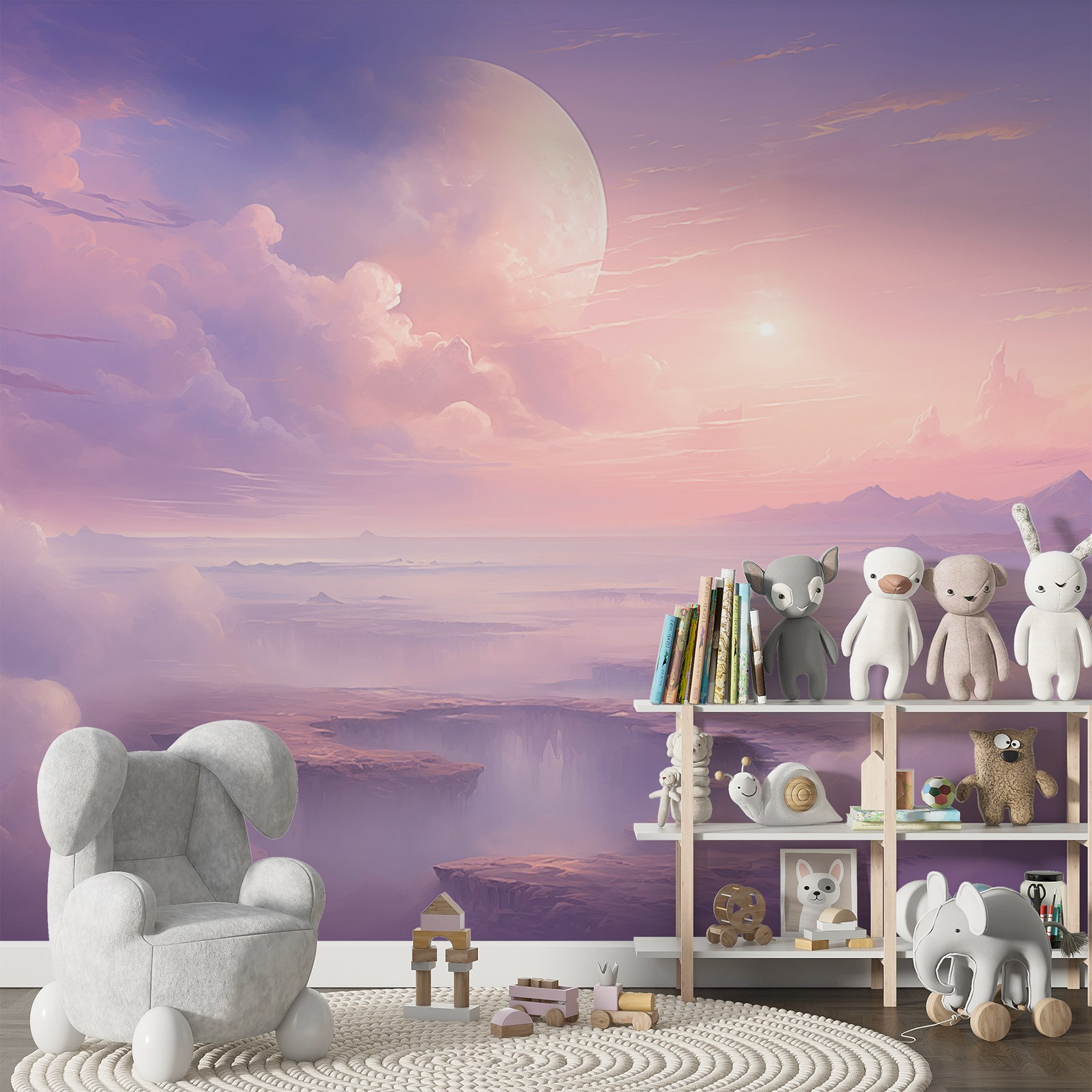 Trasformate il vostro spazio con questo murale da sogno che raffigura uno splendido paesaggio in cui soffici nuvole abbracciano una luna luminosa. È come portare la serena bellezza del crepuscolo direttamente a casa vostra. Immaginate di sdraiarvi sul divano, sorseggiare un tè e lasciarvi avvolgere dai colori rilassanti: viola tenui, rosa caldi e nuvole vaporose che invitano a sognare ad occhi aperti.