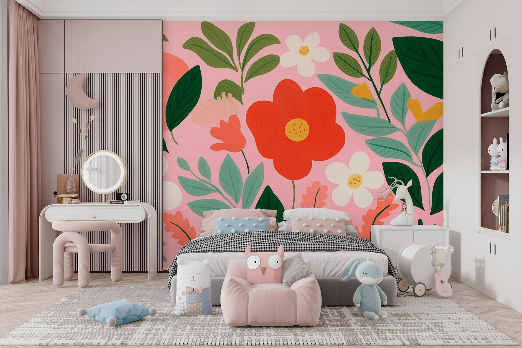 Trasformate qualsiasi stanza in un paradiso fiorito con questo vivace murale di fiori e foglie. L’allegra tavolozza danza con rossi vivaci, rosa tenui e verdi freschi, facendo sentire la primavera tutto l’anno. Immaginate di stare a casa, circondati da questa esplosione di natura, e di essere improvvisamente trasportati in un giardino soleggiato, con tanto di fiori stravaganti che sembrano rallegrarvi. Perfetto per ravvivare un salotto o per creare un accogliente angolo lettura, questo murale è come un abbraccio della natura. Immaginatelo: sorseggiate un caffè, ammirate le allegre vibrazioni e magari sognate ad occhi aperti la vostra prossima avventura all’aria aperta.