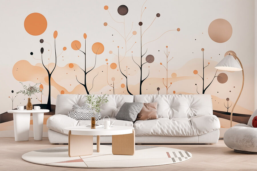 Trasformate qualsiasi spazio in un rifugio sereno con questo accattivante murale caratterizzato da alberi stravaganti e forme dolci e fluide. Immaginate di immergervi in un paesaggio da sogno ogni volta che entrate nella stanza. I colori caldi delle arance e dei marroni creano un’atmosfera accogliente, perfetta per ispirare la creatività o semplicemente per rilassarsi dopo una lunga giornata.