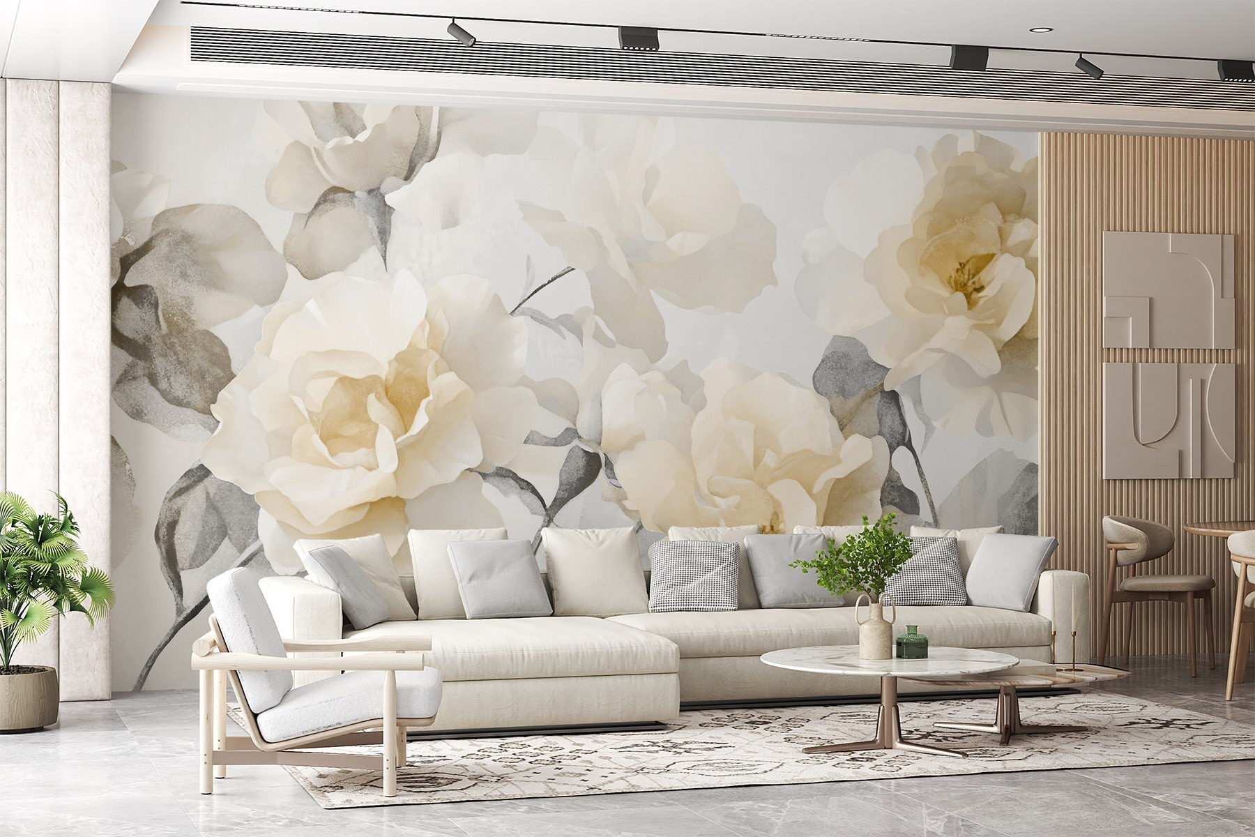 Guardate esattamente come apparirà il vostro spazio con la nuova carta da parati prima di acquistarla. Visualizzazione professionale da parte di designer esperti senza alcun costo o obbligo di acquisto.